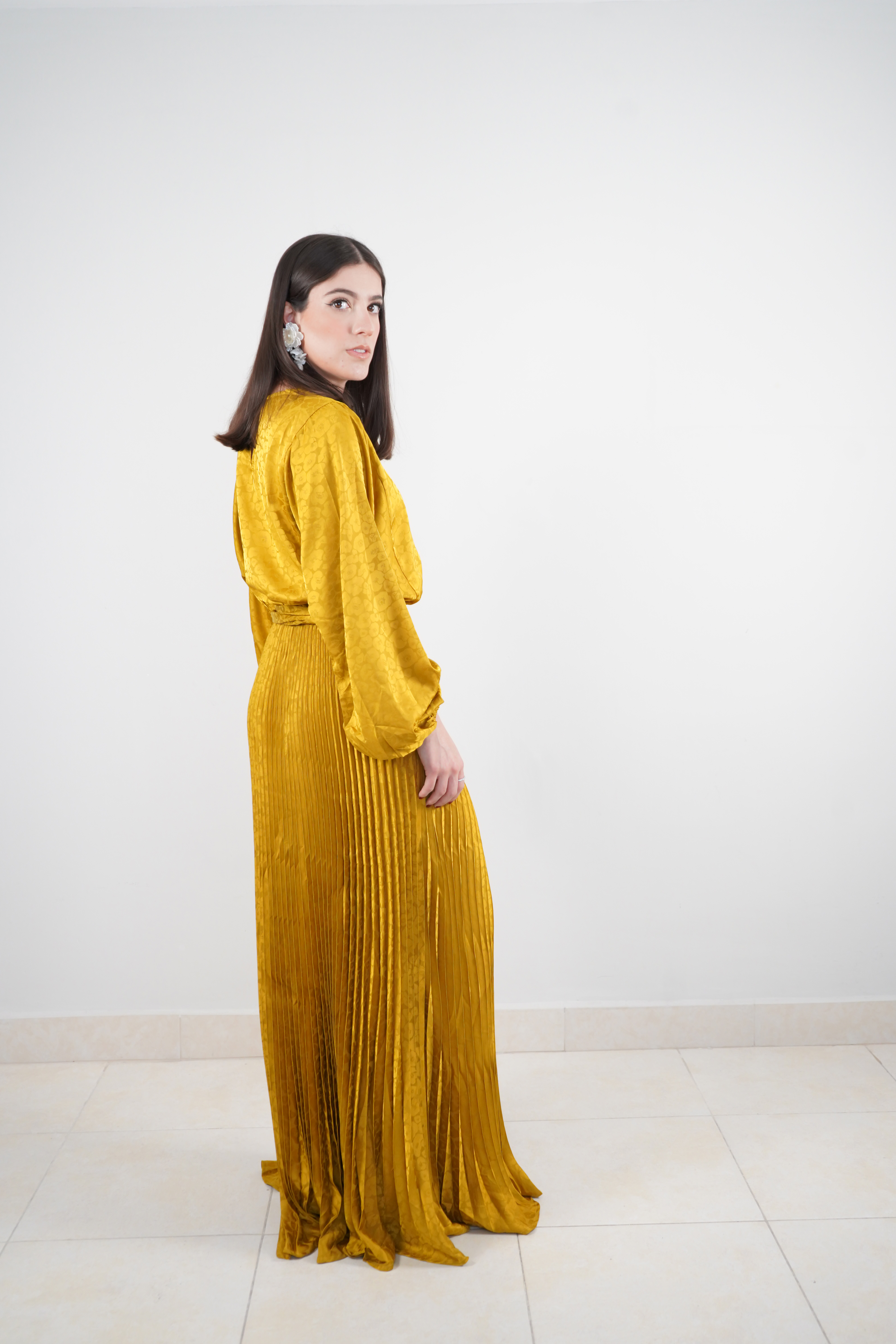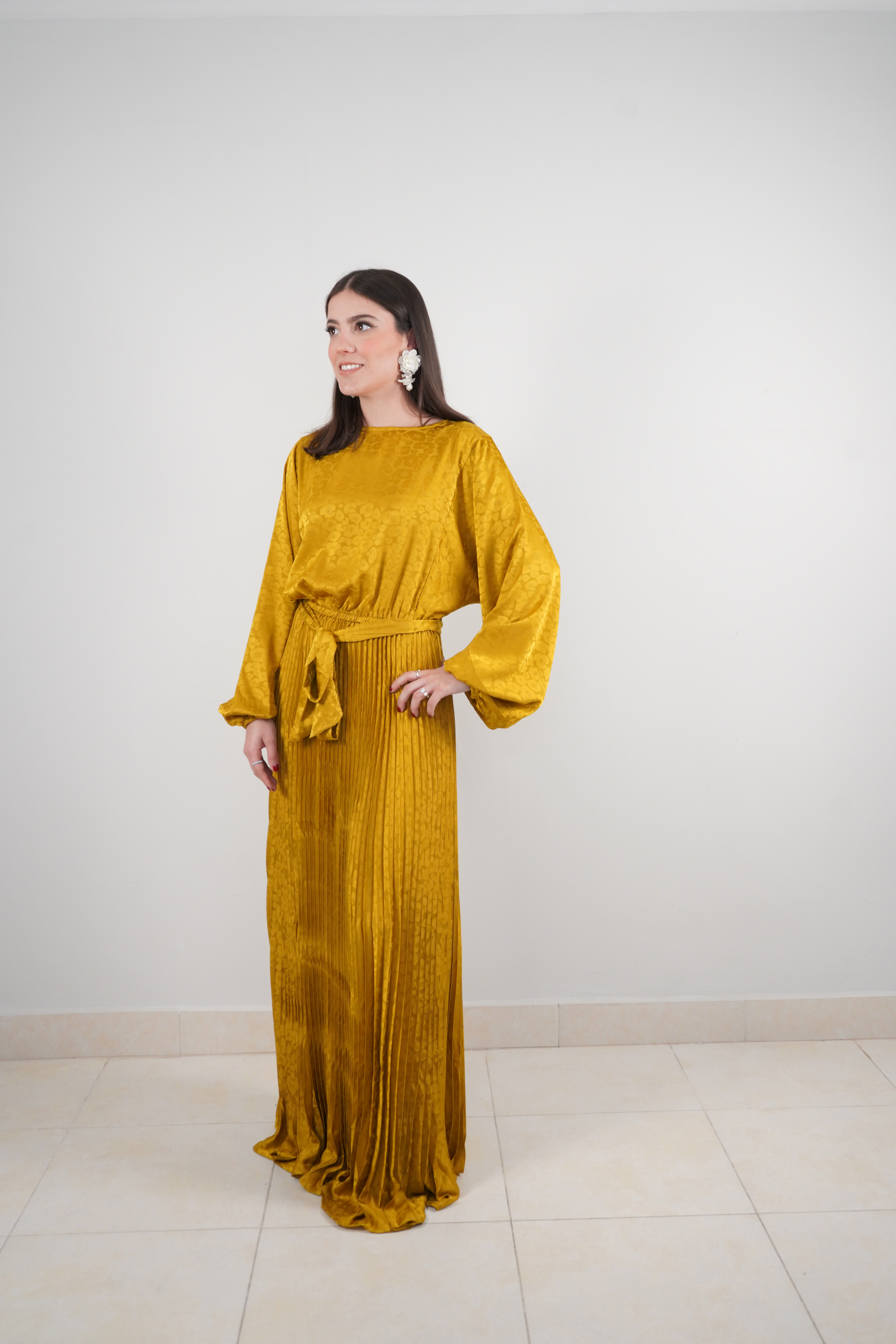 Vestido Satinado Manga Larga con Falda Plisada